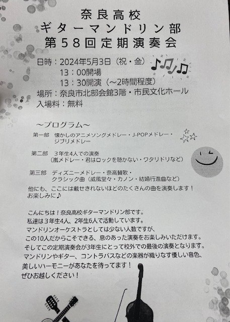 終了【ギターマンドリン部】定期演奏会が5月3日(祝・金)奈良市北部会館で開催されます。開場は13時、開演は13時30分です