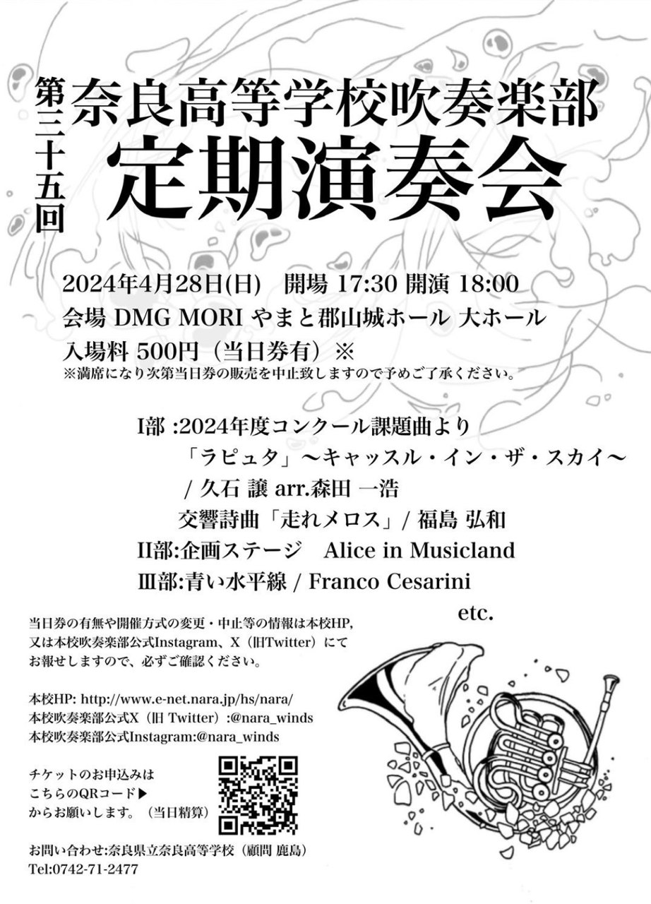 終了 【吹奏楽部】定期演奏会が4月28日(日)やまと郡山城ホール(大ホール)で開催されます。開場は17時30分、開演は18時です