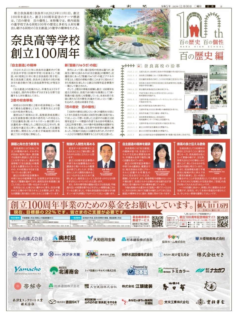 実行委員会では、1人でも多くの卒業生の皆様に記念事業を知って頂くため、「奈良高校創立100周年」特集と題した新聞紙面を展開してきました。