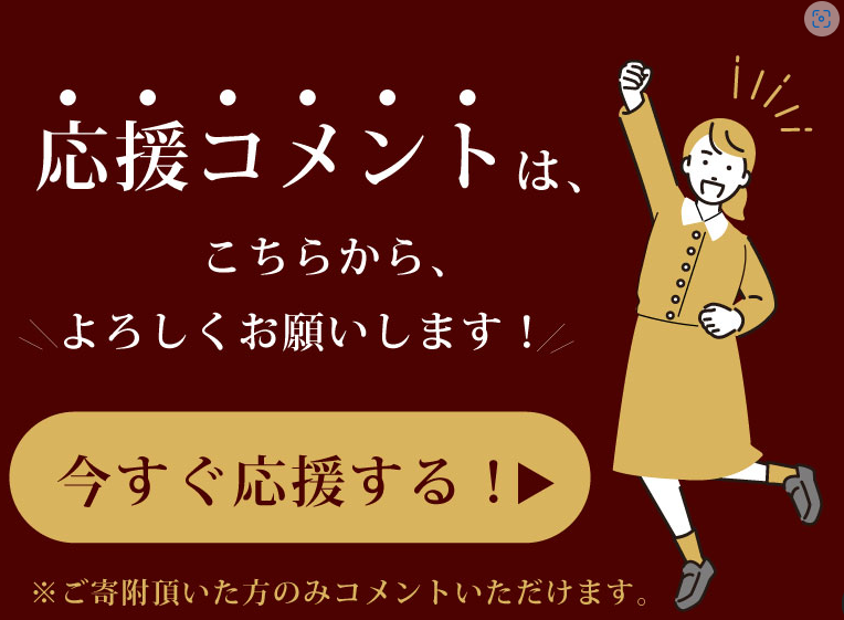 なお、本サイト以外の方法(ゆうちょ・銀行など)で募金を頂いた方々からも応援メッセージを募集しています。親しいご友人に、どうぞ、お知らせ下さい。よろしくお願いいたします。(下の画面をクリックすると展開します)