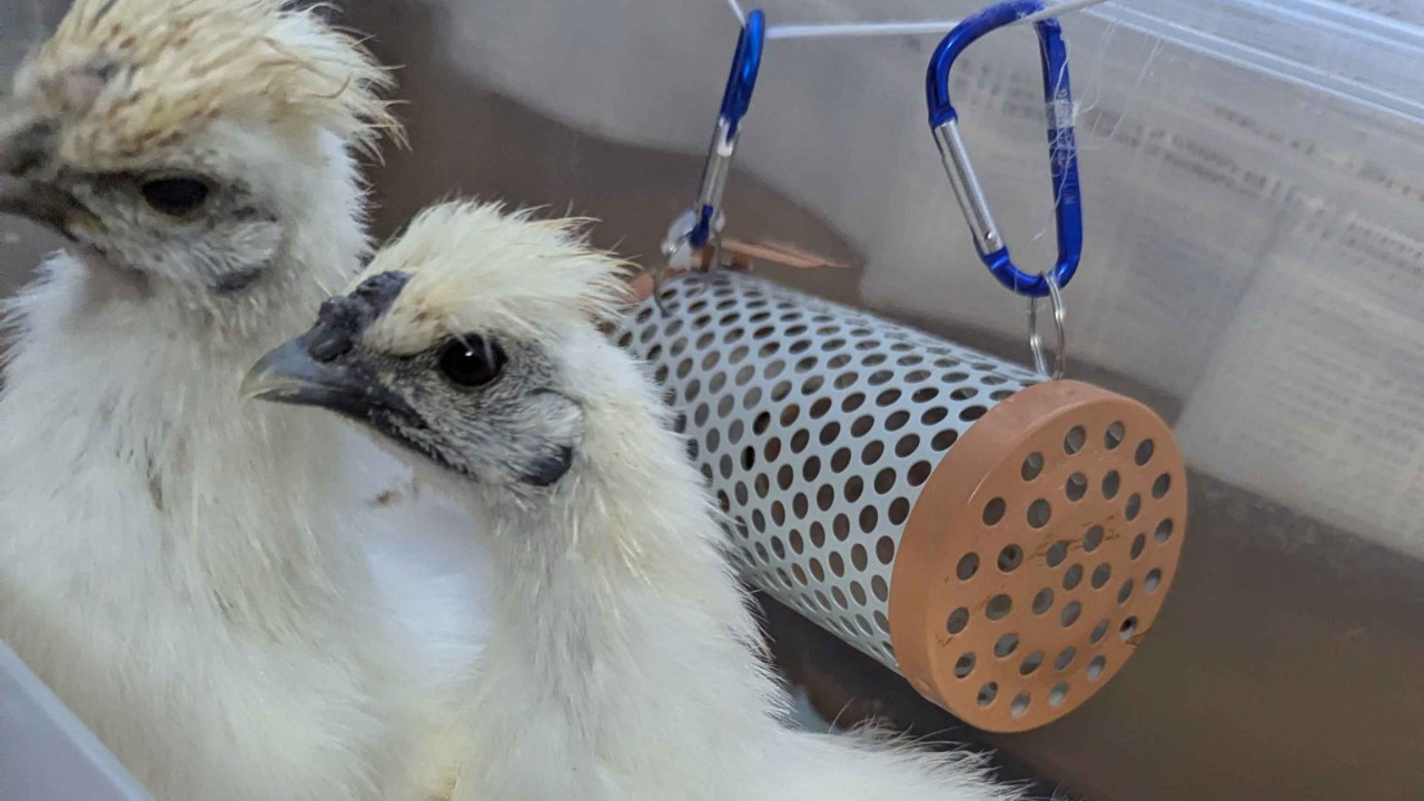 その横では、少しずつ大きくなってきたウコッケイが、入れている衣装ケースをコツコツノックしていますよ。