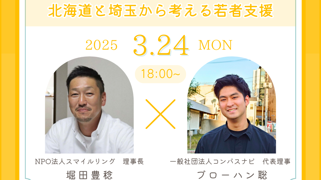 - 2025-03-11 11:08オンラインイベント「北海道と埼玉から考える若者支援」開催のお知らせ北海道と埼玉、それぞれの地域で若者支援に取り組む 「NPO法人スマイルリング」 と 「一般社団法人コンパスナビ」 がオンラインイベントを共催します!2025-03-11 11:08オンラインイベント「北海道と埼玉から考える若者支援」開催のお知らせ北海道と埼玉、それぞれの地域で若者支援に取り組む 「NPO法人スマイルリング」 と 「一般社団法人コンパスナビ」 がオンラインイベントを共催します!