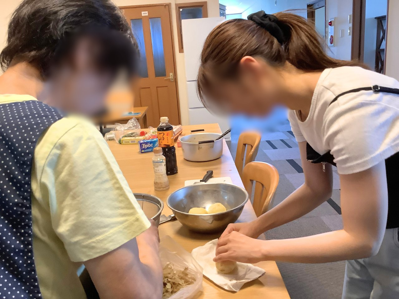食事会では入寮者と職員が協力して料理をつくり、食卓を囲みます。この協力と共有の時間が、安心感や信頼関係を育む大切な基盤となっています。