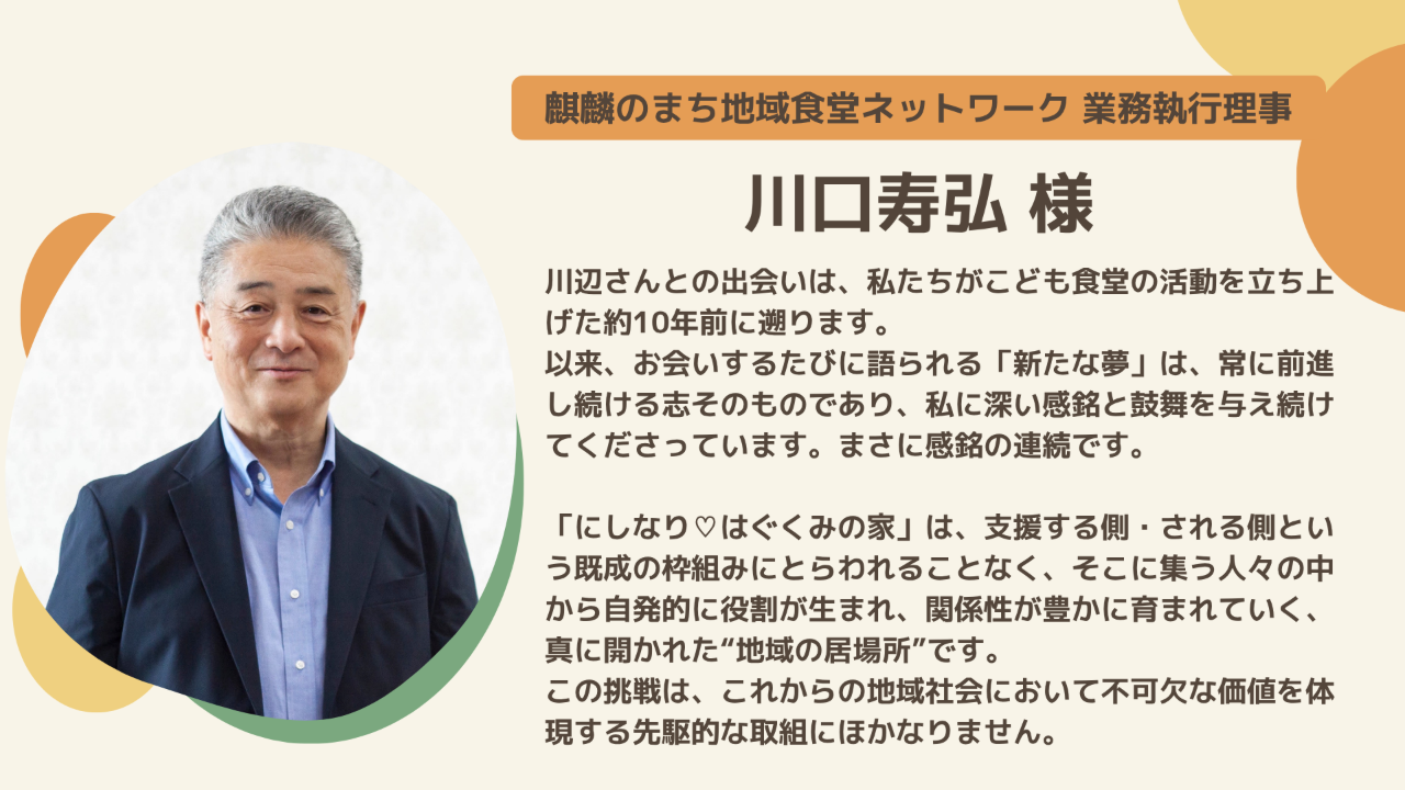 2026-04-20 18:55応援メッセージのご紹介20:川口寿弘様(麒麟のまち地域食堂ネットワーク 業務執行理事・事務局長)一般社団法人麒麟のまち地域食堂ネットワークの業務執行理事・事務局長である 川口寿弘様からいただいた応援メッセージをご紹介します!2026-04-20 18:55応援メッセージのご紹介20:川口寿弘様(麒麟のまち地域食堂ネットワーク 業務執行理事・事務局長)一般社団法人麒麟のまち地域食堂ネットワークの業務執行理事・事務局長である 川口寿弘様からいただいた応援メッセージをご紹介します!