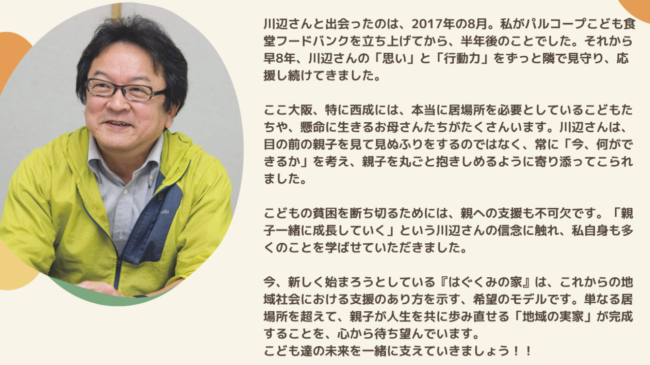 2026-03-30 17:26【クラファン進捗報告】開始から約2週間で目標金額の20%に到達!西成に生き直すための地域の実家を!「にしなり♡はぐくみの家」プロジェクト進捗のご報告2026-03-30 17:26【クラファン進捗報告】開始から約2週間で目標金額の20%に到達!西成に生き直すための地域の実家を!「にしなり♡はぐくみの家」プロジェクト進捗のご報告