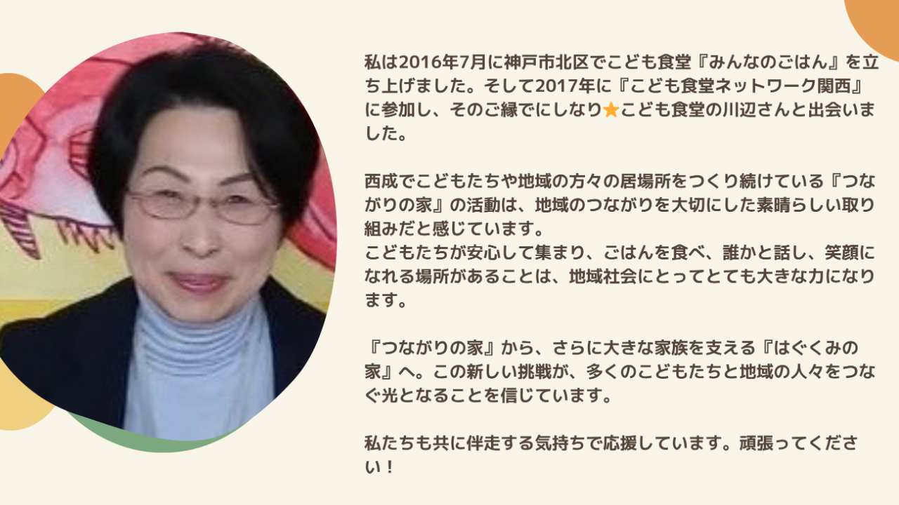 2026-03-24 15:16応援メッセージのご紹介5:小野田悦子様(NPO法人みんなのごはん代表)みんなのごはんの代表である小野田悦子様からいただいた応援メッセージをご紹介します!2026-03-24 15:16応援メッセージのご紹介5:小野田悦子様(NPO法人みんなのごはん代表)みんなのごはんの代表である小野田悦子様からいただいた応援メッセージをご紹介します!
