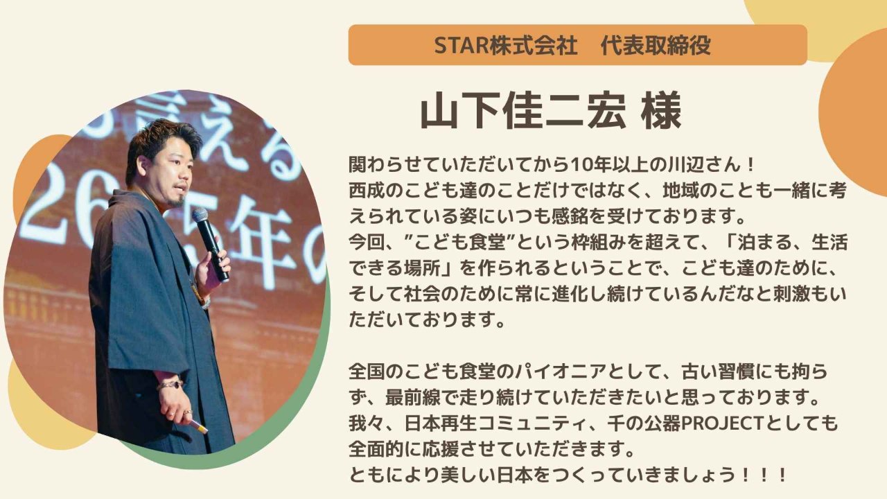2026-03-24 15:30応援メッセージのご紹介7:山下佳二宏様(STAR株式会社代表取締役)STAR株式会社の代表取締役である山下佳二宏様からいただいた応援メッセージをご紹介します!2026-03-24 15:30応援メッセージのご紹介7:山下佳二宏様(STAR株式会社代表取締役)STAR株式会社の代表取締役である山下佳二宏様からいただいた応援メッセージをご紹介します!