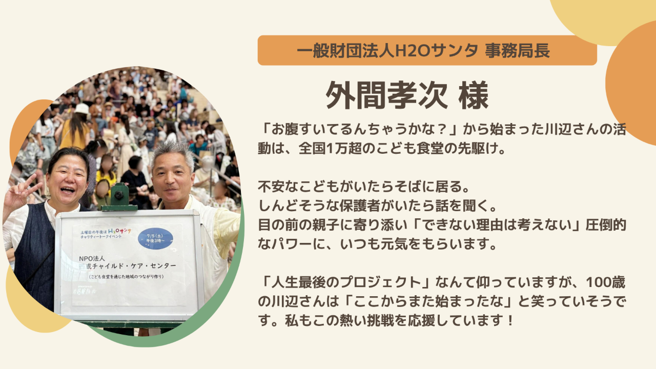 2026-03-24 15:45応援メッセージのご紹介10:外間孝次様(一般財団法人H2Oサンタ 事務局長)一般財団法人H2Oサンタの事務局長である外間孝次様からいただいた応援メッセージをご紹介します!2026-03-24 15:45応援メッセージのご紹介10:外間孝次様(一般財団法人H2Oサンタ 事務局長)一般財団法人H2Oサンタの事務局長である外間孝次様からいただいた応援メッセージをご紹介します!