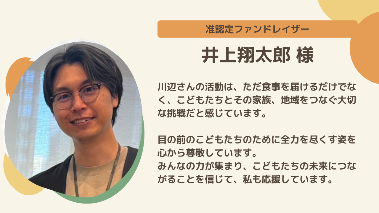 2026-04-20 20:15応援メッセージのご紹介21:井上翔太郎様(准認定ファンドレイザー)准認定ファンドレイザーの井上翔太郎様からいただいた応援メッセージをご紹介します!2026-04-20 20:15応援メッセージのご紹介21:井上翔太郎様(准認定ファンドレイザー)准認定ファンドレイザーの井上翔太郎様からいただいた応援メッセージをご紹介します!