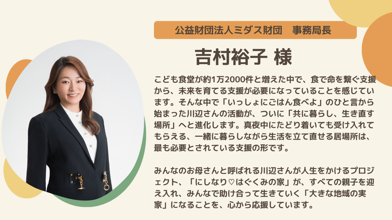 公益財団法人ミダス財団の事務局長である吉村裕子様からいただいた応援メッセージをご紹介します!