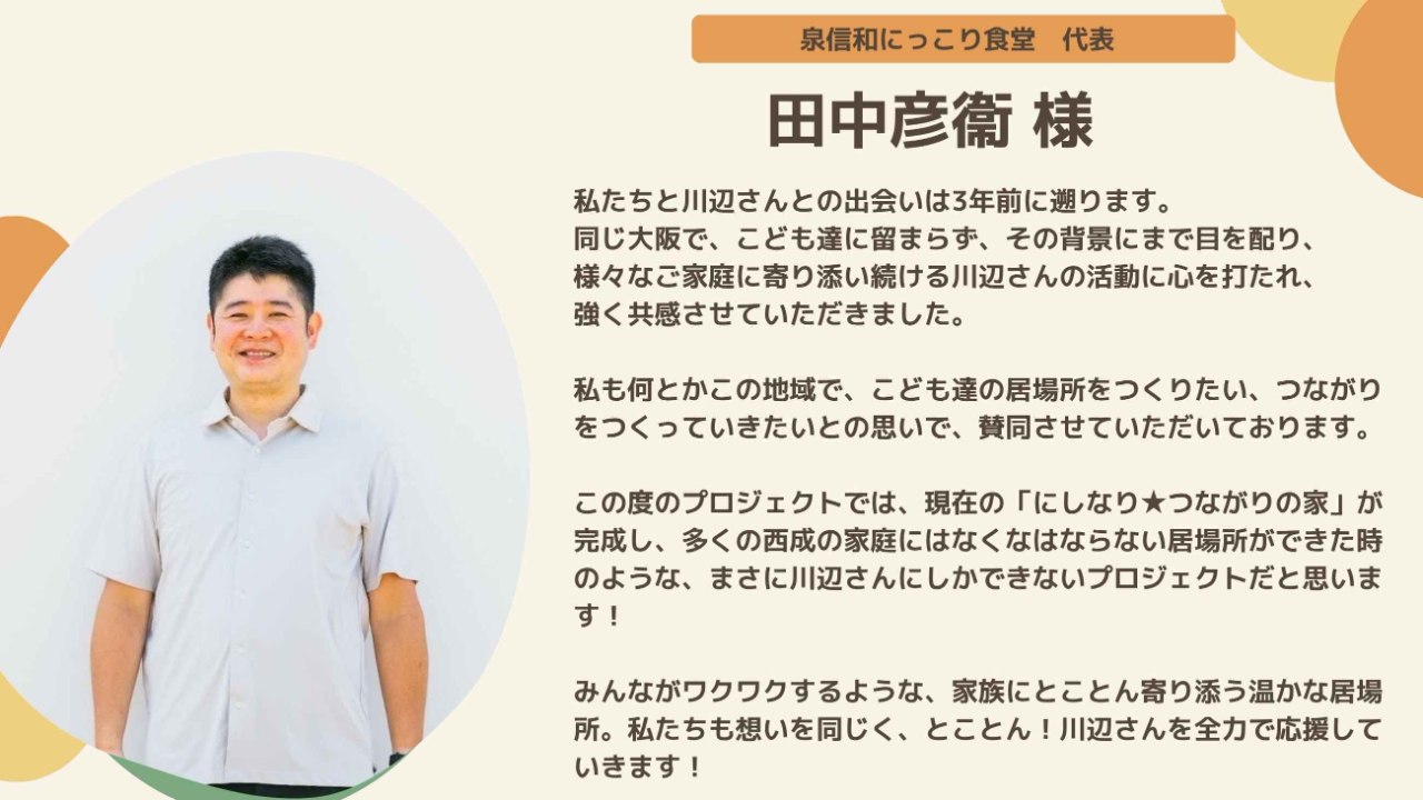 応援メッセージのご紹介14:田中彦衞様(泉信和にっこり食堂代表)