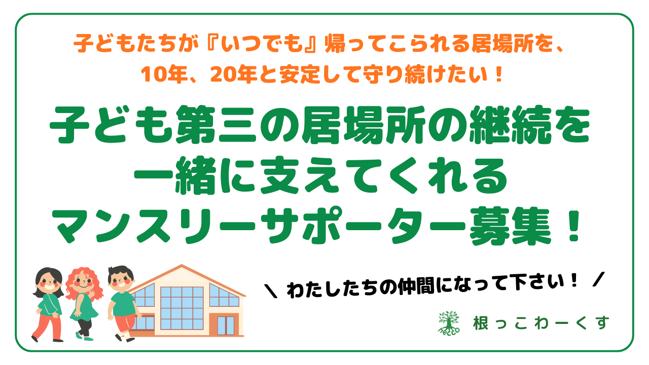- あなたからの「3,000円〜/月」で 居場所の「施設継続」「スタッフ確保」を支えて下さい。