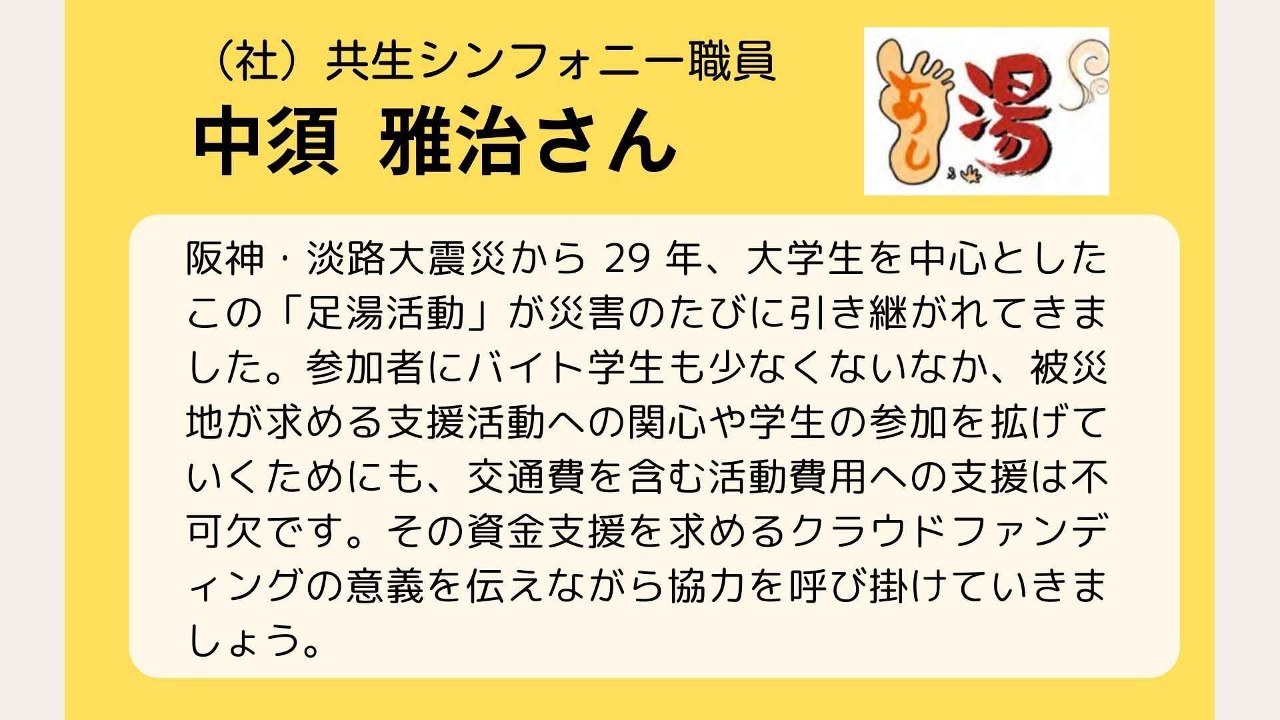 阪神・淡路大震災から 29 年、大学生を中心としたこの「足湯活動」が災害のたびに引き継がれてきました。参加者にバイト学生も少なくないなか、被災地が求める支援活動への関心や学生の参加を拡げていくためにも、交通費を含む活動費用への支援は不可欠です。その資金支援を求めるクラウドファンディングの意義を伝えながら協力を呼び掛けていきましょう。
