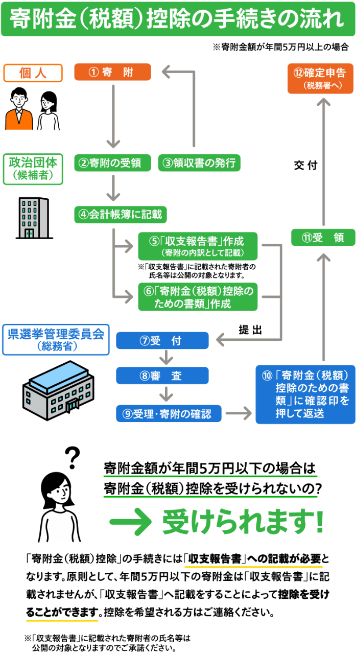 - 年間5万円を超える(5万1円以上)寄附については、収支報告書に「寄附年月日、金額、氏名、住所、職業」が掲載・開示されますので、ご了承ください。