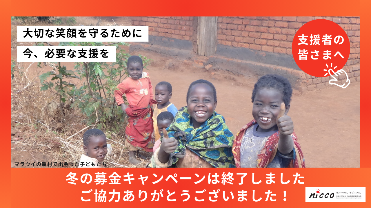 2026-01-23 12:13【お礼とご報告】皆さまの温かいご支援をありがとうございました。この度は、私たち日本国際民間協力会(NICCO)による「NICCO冬の募金キャンペーン2025」にご協力いただき、誠にありがとうございました。 2026年1月20日をもちまして、当キャンペーンは終了いたしました。 NICCOの活動に想いを寄せてくださり、皆さまから計78,000円のご寄付を頂戴いたしました。 たくさんのご支援・ご協力に、心より感謝申し上げます。 皆さまからお寄せいただいた温かいお気持ちは、困難な状況下にある人々のもとへ、大切に届けてまいります。 NICCOはこれからも、紛争や災害、貧困の中でも懸命に生きる一人ひとりの声に耳を傾け、すべての人が希望を持てる社会を目指し、活動を続けてまいります。 今後ともNICCOの活動を温かく見守っていただければ幸いです。 改めまして、温かいご支援と応援メッセージを、本当にありがとうございました。 NICCOスタッフ一同2026-01-23 12:13【お礼とご報告】皆さまの温かいご支援をありがとうございました。この度は、私たち日本国際民間協力会(NICCO)による「NICCO冬の募金キャンペーン2025」にご協力いただき、誠にありがとうございました。 2026年1月20日をもちまして、当キャンペーンは終了いたしました。 NICCOの活動に想いを寄せてくださり、皆さまから計78,000円のご寄付を頂戴いたしました。 たくさんのご支援・ご協力に、心より感謝申し上げます。 皆さまからお寄せいただいた温かいお気持ちは、困難な状況下にある人々のもとへ、大切に届けてまいります。 NICCOはこれからも、紛争や災害、貧困の中でも懸命に生きる一人ひとりの声に耳を傾け、すべての人が希望を持てる社会を目指し、活動を続けてまいります。 今後ともNICCOの活動を温かく見守っていただければ幸いです。 改めまして、温かいご支援と応援メッセージを、本当にありがとうございました。 NICCOスタッフ一同