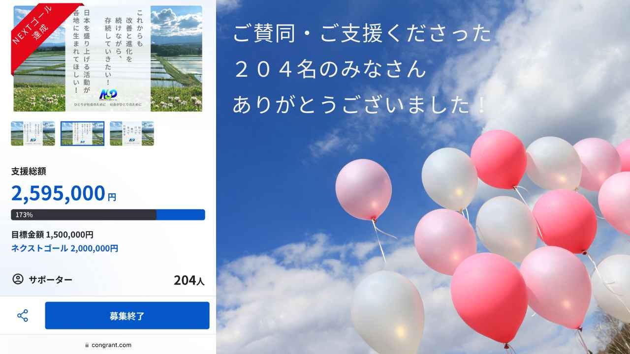 - 2025-01-21 20:20皆さまからの温かいご賛同・ご支援のおかげで、第一目標150万円達成!「これからも日本を元気に盛り上げたい! だからこそ、改めてみんなの力が必要です!」と題して、1月11日(土)より始めましたクラウドファンディング、おかげさまで第一目標金額を達成することができました! 私たちの想い・行動に共感・応援してくださる皆さんからのあたたかいお気持ち・ご参加・ご支援をお寄せいただき、本当にありがとうございました。 今年もご縁の輪、ヨコのつながりにとても嬉しく、感謝の気持ちでいっぱいです。関係者一同、心より感謝申し上げます。 「これからも改善と進化を続けながら存続していきたい!」「日本を盛り上げる活動が各地に生まれてほしい!」想い・行動をさらにもう一歩前進するため、ネクストゴール200万円達成に向けて、温かいご支援をどうぞよろしくお願いいたします!2025-01-21 20:20皆さまからの温かいご賛同・ご支援のおかげで、第一目標150万円達成!「これからも日本を元気に盛り上げたい! だからこそ、改めてみんなの力が必要です!」と題して、1月11日(土)より始めましたクラウドファンディング、おかげさまで第一目標金額を達成することができました! 私たちの想い・行動に共感・応援してくださる皆さんからのあたたかいお気持ち・ご参加・ご支援をお寄せいただき、本当にありがとうございました。 今年もご縁の輪、ヨコのつながりにとても嬉しく、感謝の気持ちでいっぱいです。関係者一同、心より感謝申し上げます。 「これからも改善と進化を続けながら存続していきたい!」「日本を盛り上げる活動が各地に生まれてほしい!」想い・行動をさらにもう一歩前進するため、ネクストゴール200万円達成に向けて、温かいご支援をどうぞよろしくお願いいたします!