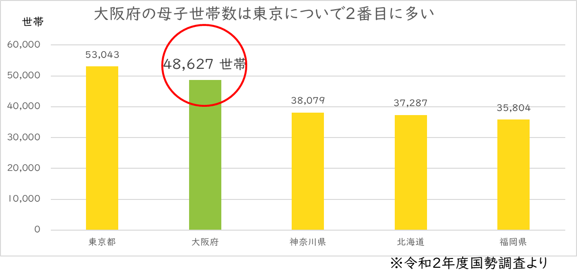 全国で母子家庭の数は119万世帯あり、大阪は全国でも東京についで2番目に多い自治体となっています。