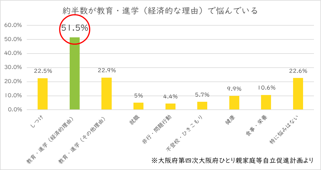 母子家庭の母が子どものことで悩んでいるのは、「教育・進学(経済的理由)」です。大阪府の調査では、約半数の家庭が経済的な理由で子どもの進学について困りごとを持っています。(※大阪府第四次大阪府ひとり親家庭等自立促進計画より)