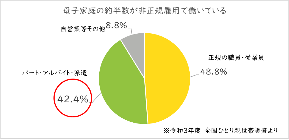 所得が低いことの原因として、非正規雇用の割合の高さがあります。派遣・パート・アルバイトなど非正規雇用で働く母子家庭の割合は42%とおよそ半数になっています。(※令和3年度 全国ひとり親世帯調査より)