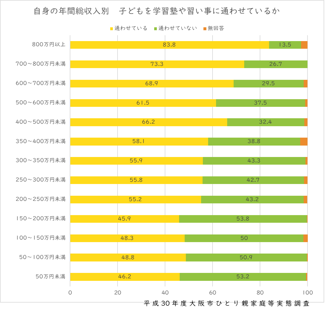 学習塾や習い事に通わせているかどうか、についても、年収が多いほど通わせている割合が高く、自身の年収によって格差が生じてしまうことがわかります。(※平成30年度 大阪市ひとり親家庭実態調査)