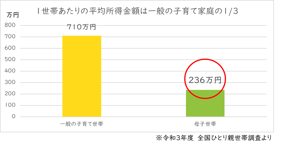 また、母子世帯のうち働いて得ている雇用所得の平均は236万円(※就労による収入のみ)と、一般の子育て世帯の雇用所得710万円の1/3となっています。(※令和3年度 全国ひとり親世帯調査より)