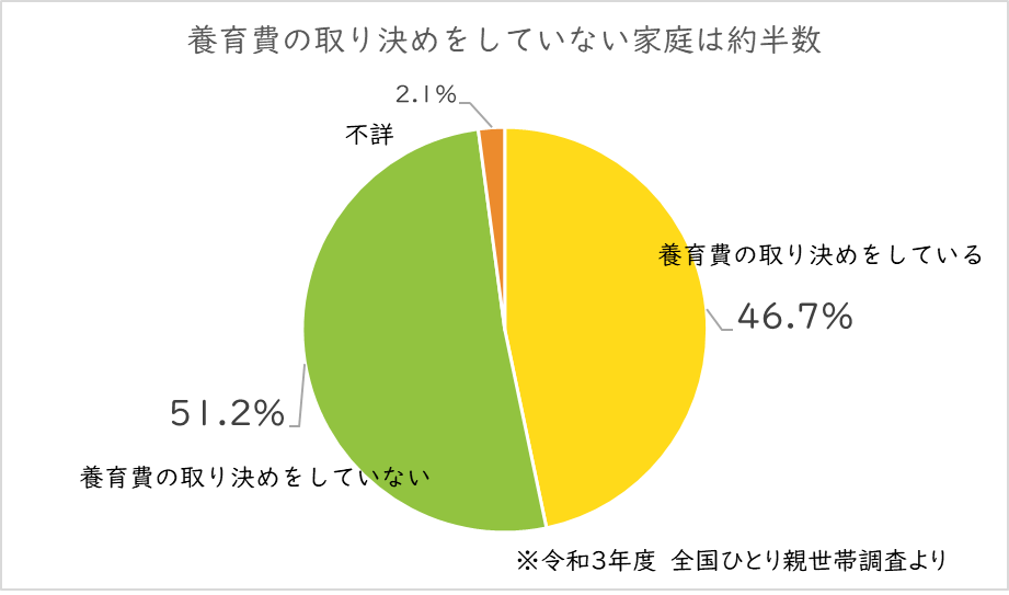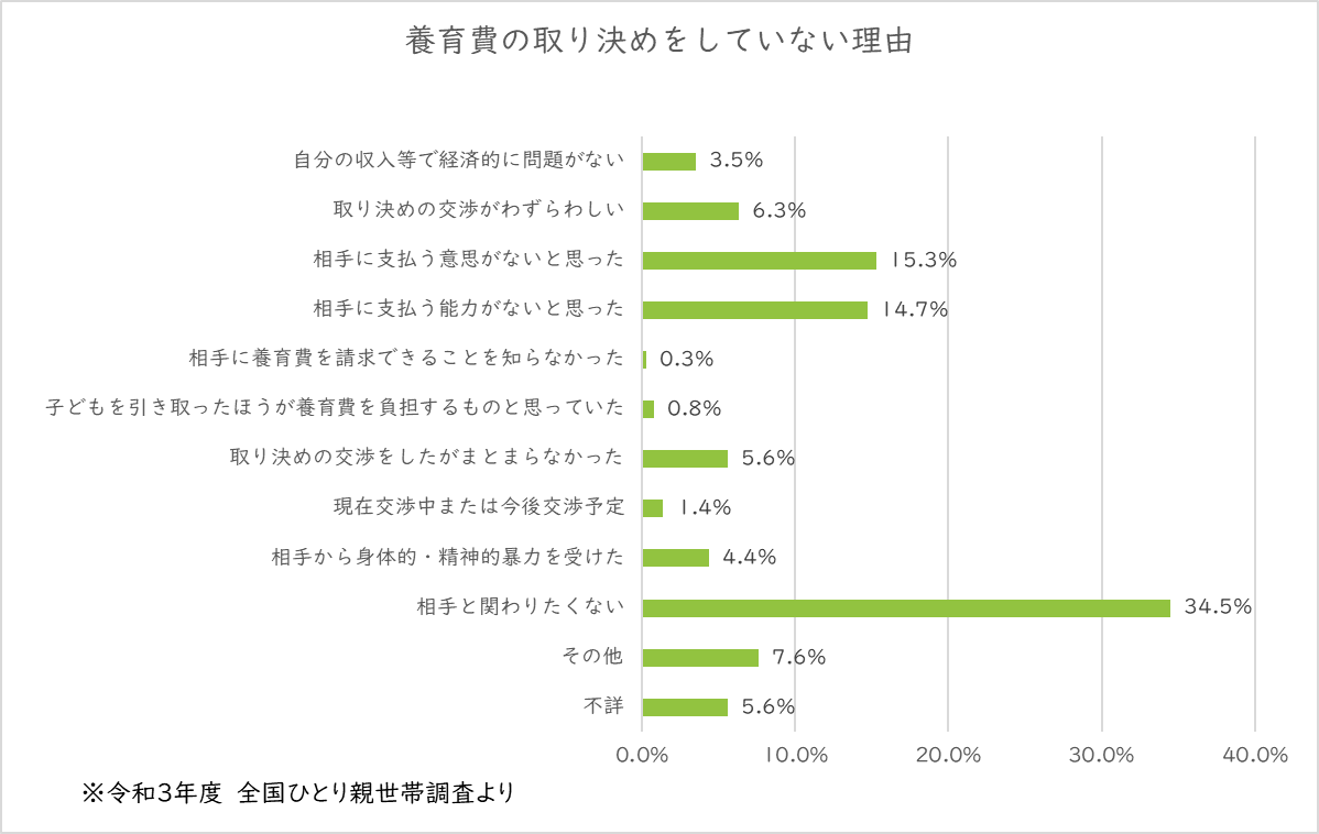 養育費の取り決めをしていない家庭も約半数にのぼります。取り決めをしていない理由は、「相手に関わりたくない」が最も多く、また「相手に支払う意思・能力がないと思った」という回答が続きます。(※令和3年度 全国ひとり親世帯調査より)