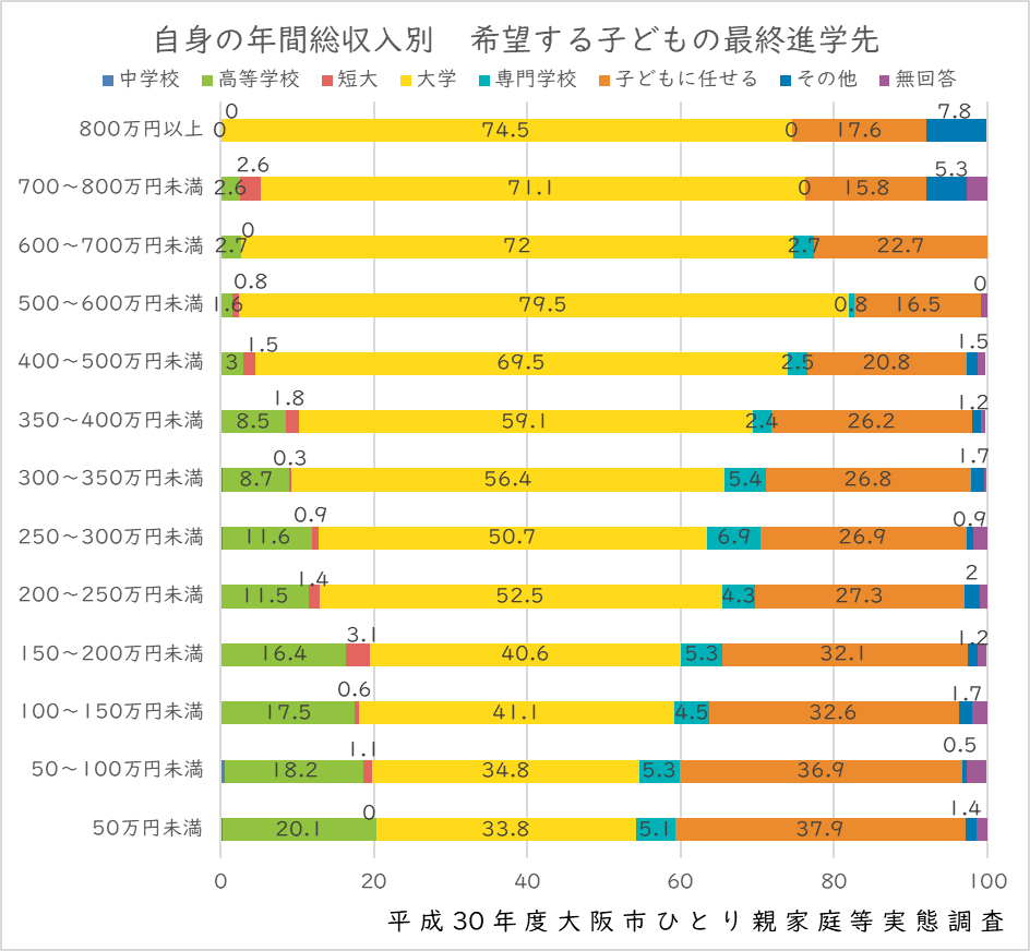 また、希望する子どもの最終進学先についても、年収別に大きく差が出ています。年収が高い世帯ほど大学を希望する割合が高まっています。(※平成30年度 大阪市ひとり親家庭実態調査)