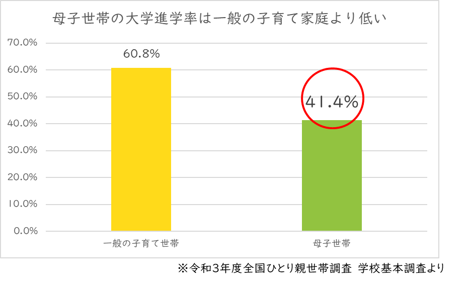 また、大学の進学率にも影響が現れています。一般の子育て世帯の子どもの大学進学率が6割あるのに対し母子世帯は4割にとどまっています。(※令和3年度全国ひとり親世帯調査 学校基本調査より)