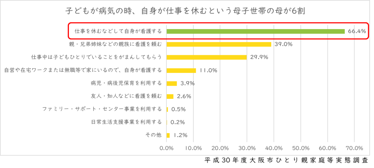 大阪市の調査では、子どもが病気の時、66.4%の母子家庭の母が「仕事を休むなどして自身が看護する」と回答しています。そのほか、「仕事中は子どもがひとりでいることをがまんしてもらう」という回答も29.9%と、子どもの病気によって自身の仕事に影響があったり、子どもに我慢をさせてしまったりすることがわかります。(※平成30年度 大阪市ひとり親家庭実態調査)