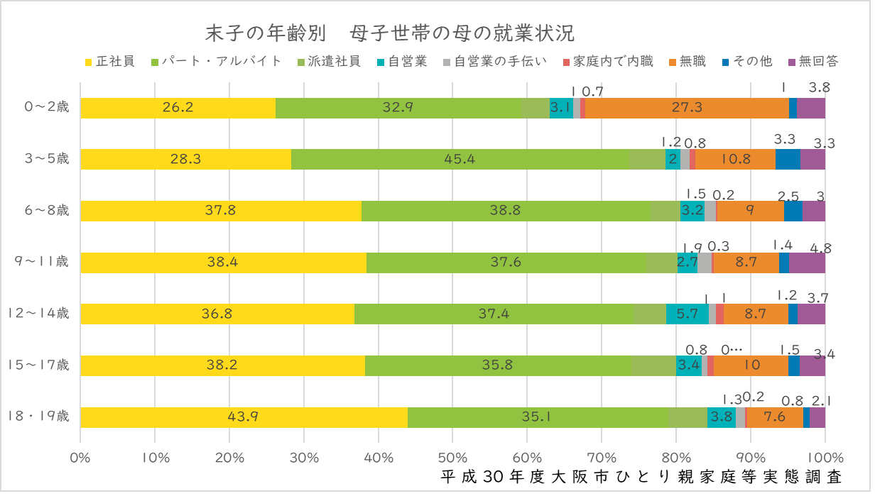 また、末子の年齢別に見ると、風邪を引きやすい低年齢の子どもの母親ほど、正社員の割合は低く、パート・アルバイトの割合が高いことがわかります。(※平成30年度 大阪市ひとり親家庭実態調査)