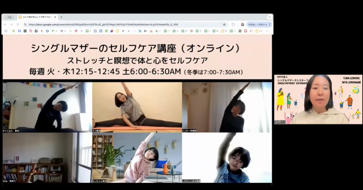 NPO法人シングルマザーズシスタフッドでは、自分の身体や心をセルフケアし、オンラインで地域を超えて交流することで互いを励まし合える機会を提供しています。