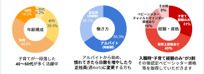 また保育未経験でも「子どもが大好き」「子育てをサポートしたい」とチャレンジしてくださる方も多く活躍しています。