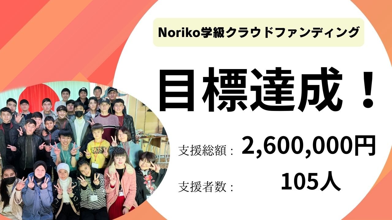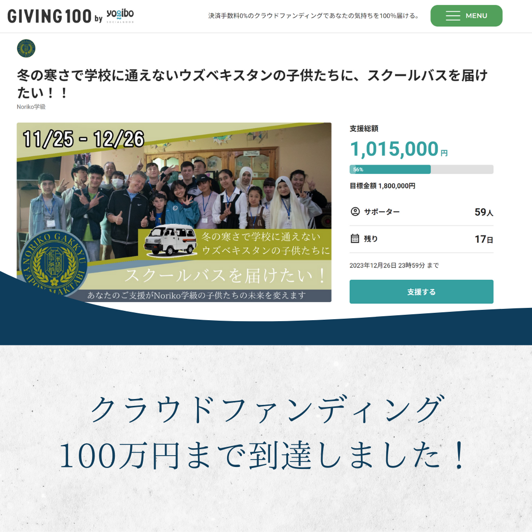 2023-12-27 20:09ご支援ありがとうございました 【クラウドファンディング終了報告】12月26日をもちまして、クラウドファンディング終了しました! 支援総額は、なんと、260万円です! 当初の目標金額180万円、そしてネクストゴール250万円を達成することができました!本当にありがとうございました! 今回のクラウドファンディングでスクールバス、ガソリン発電機を購入することができます。それにより、Noriko学級の子どもたちは寒い冬の間でも、Noriko学級に通い、明るく暖かい環境で日本語を勉強することができるようになりました。 Noriko学級のクラウドファンディングを応援してくださった多くの皆様、 今回のクラウドファンディング成功したのは皆様のおかげです。本当にありがとうございました。 Noriko学級はこれからも、地元の子どもたちのため、日本とウズベキスタンの架け橋となるため、活動し続けます!今後ともNoriko学級の応援よろしくお願いします。2023-12-27 20:09ご支援ありがとうございました 【クラウドファンディング終了報告】12月26日をもちまして、クラウドファンディング終了しました! 支援総額は、なんと、260万円です! 当初の目標金額180万円、そしてネクストゴール250万円を達成することができました!本当にありがとうございました! 今回のクラウドファンディングでスクールバス、ガソリン発電機を購入することができます。それにより、Noriko学級の子どもたちは寒い冬の間でも、Noriko学級に通い、明るく暖かい環境で日本語を勉強することができるようになりました。 Noriko学級のクラウドファンディングを応援してくださった多くの皆様、 今回のクラウドファンディング成功したのは皆様のおかげです。本当にありがとうございました。 Noriko学級はこれからも、地元の子どもたちのため、日本とウズベキスタンの架け橋となるため、活動し続けます!今後ともNoriko学級の応援よろしくお願いします。
