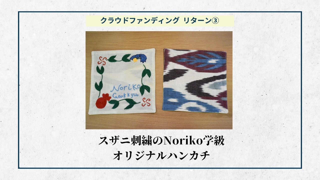 2024-01-24 08:41リターンの準備ができました③ 【スザニ刺繍のNoriko学級オリジナルハンカチ】大変長らくお待たせいたしました。ようやくリターンの準備ができました。リターンを通して皆様にNoriko学級からの感謝の気持ちをお伝えしたいと思います。 今週1週間でNoriko学級を支援してくださった皆様へリターンのお渡しを予定しております。 本日はスザニ刺繍のNoriko学級オリジナルハンカチを紹介させていただきます!2024-01-24 08:41リターンの準備ができました③ 【スザニ刺繍のNoriko学級オリジナルハンカチ】大変長らくお待たせいたしました。ようやくリターンの準備ができました。リターンを通して皆様にNoriko学級からの感謝の気持ちをお伝えしたいと思います。 今週1週間でNoriko学級を支援してくださった皆様へリターンのお渡しを予定しております。 本日はスザニ刺繍のNoriko学級オリジナルハンカチを紹介させていただきます!