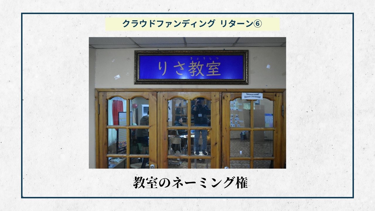 2024-01-25 10:14リターンの準備ができました④ 【Noriko学級教室のネーミング権】大変長らくお待たせいたしました。ようやくリターンの準備ができました。リターンを通して皆様にNoriko学級からの感謝の気持ちをお伝えしたいと思います。 今週1週間でNoriko学級を支援してくださった皆様へリターンのお渡しを予定しております。 本日はNoriko学級教室のネーミング権を紹介させていただきます!2024-01-25 10:14リターンの準備ができました④ 【Noriko学級教室のネーミング権】大変長らくお待たせいたしました。ようやくリターンの準備ができました。リターンを通して皆様にNoriko学級からの感謝の気持ちをお伝えしたいと思います。 今週1週間でNoriko学級を支援してくださった皆様へリターンのお渡しを予定しております。 本日はNoriko学級教室のネーミング権を紹介させていただきます!