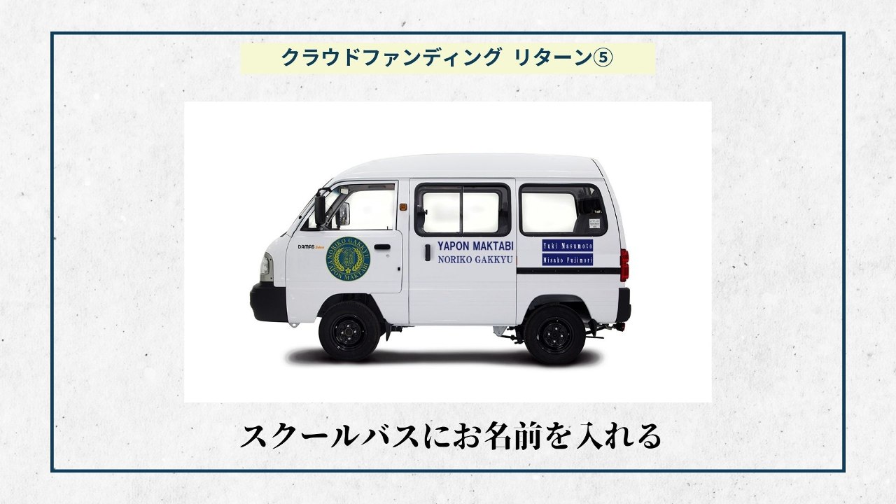 2024-01-29 02:29リターンの準備ができました⑥ 【スクールバスにお名前を入れる】大変長らくお待たせいたしました。ようやくリターンの準備ができました。リターンを通して皆様にNoriko学級からの感謝の気持ちをお伝えしたいと思います。 今週1週間でNoriko学級を支援してくださった皆様へリターンのお渡しを予定しております。 本日はをスクールバスに名前を入れるリターンについて紹介させていただきます!2024-01-29 02:29リターンの準備ができました⑥ 【スクールバスにお名前を入れる】大変長らくお待たせいたしました。ようやくリターンの準備ができました。リターンを通して皆様にNoriko学級からの感謝の気持ちをお伝えしたいと思います。 今週1週間でNoriko学級を支援してくださった皆様へリターンのお渡しを予定しております。 本日はをスクールバスに名前を入れるリターンについて紹介させていただきます!
