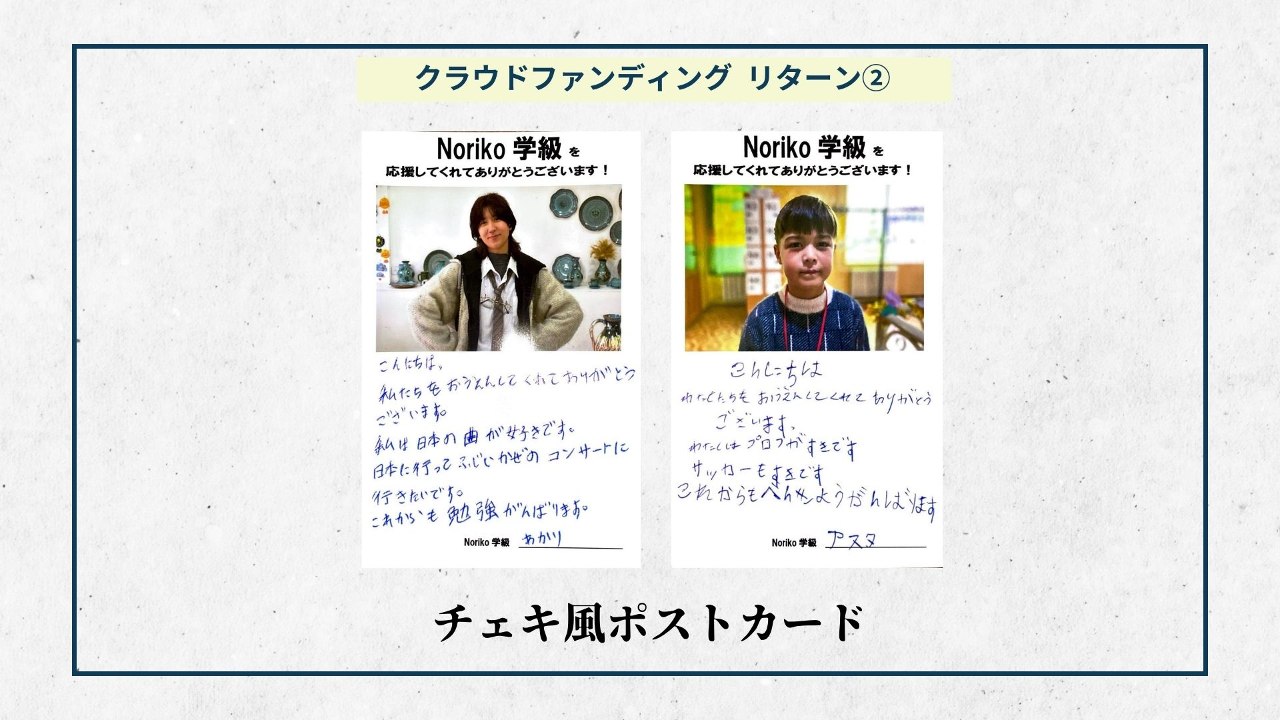 2024-01-23 11:25リターンの準備ができました② 【チェキ風ポストカード】大変長らくお待たせいたしました。ようやくリターンの準備ができました。リターンを通して、皆様にNoriko学級からの感謝の気持ちをお伝えしたいと思います。 今週1週間でクラウドファンディングを支援してくださった皆様へリターンのお渡しを予定しております。 本日は【チェキ風ポストカード】を紹介させていただきます!2024-01-23 11:25リターンの準備ができました② 【チェキ風ポストカード】大変長らくお待たせいたしました。ようやくリターンの準備ができました。リターンを通して、皆様にNoriko学級からの感謝の気持ちをお伝えしたいと思います。 今週1週間でクラウドファンディングを支援してくださった皆様へリターンのお渡しを予定しております。 本日は【チェキ風ポストカード】を紹介させていただきます!