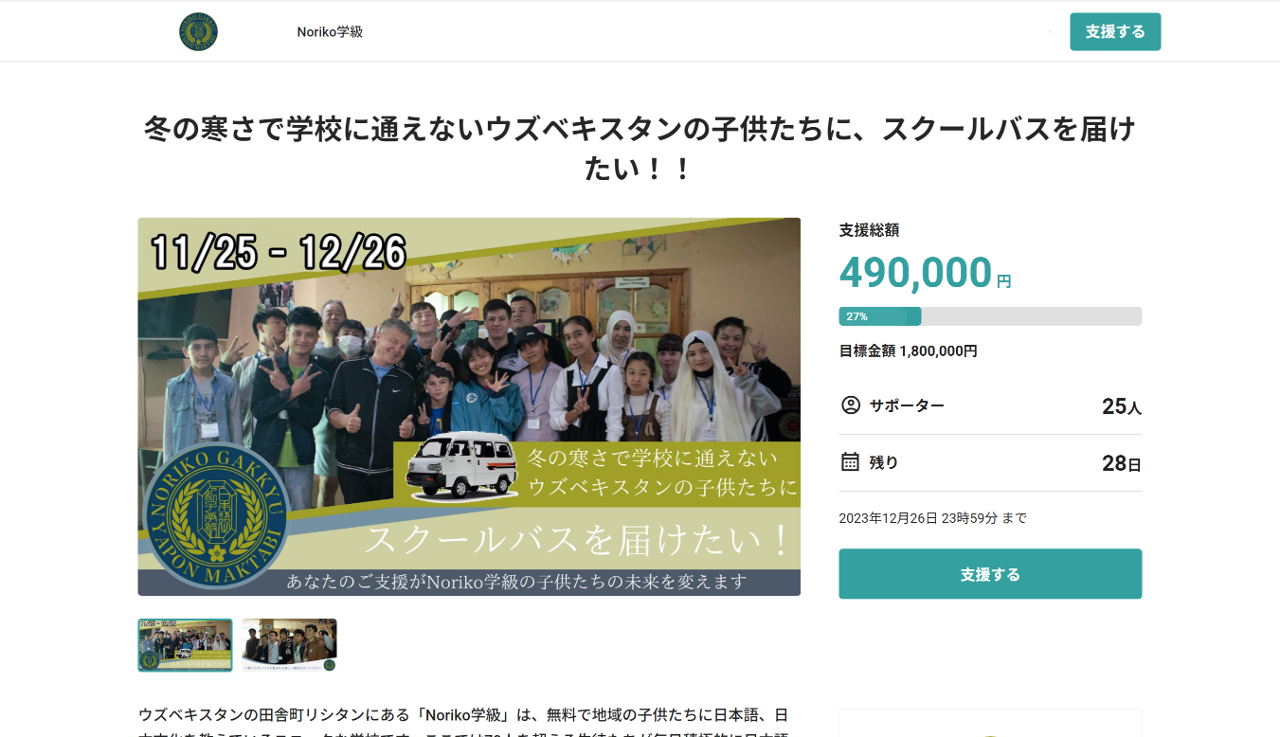 「冬の寒さで学校に通えないウズベキスタンの子供たちに、スクールバスを届けたい!!」 Noriko学級クラウドファンディングプロジェクトが始まって、3日が経ちました!