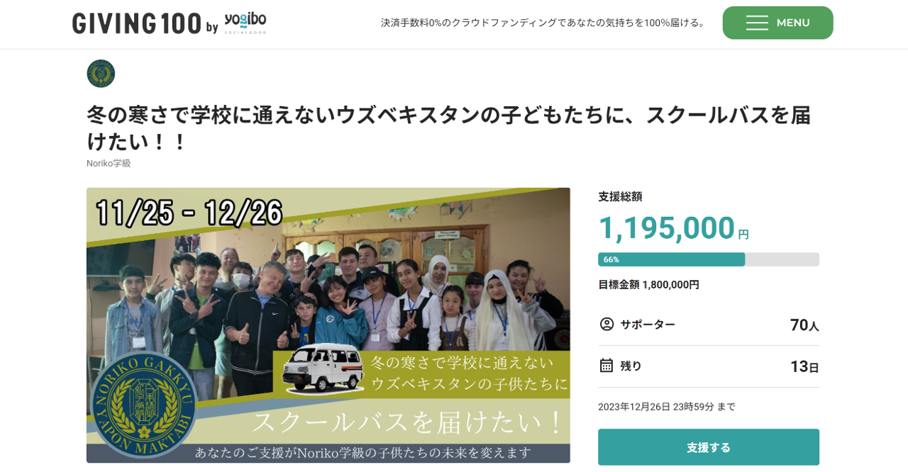 そこで、生徒たちが冬の間も安心してNoriko学級に通うことができるように 【スクールバス】 の購入を目指しています!