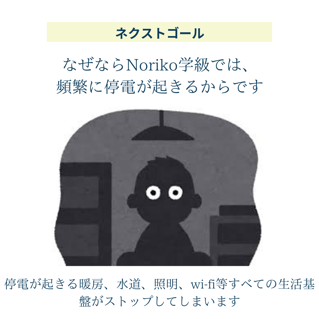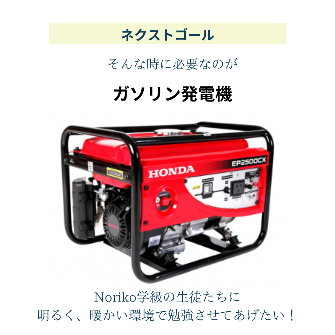 そんな状況を少しずつ改善していきたいと思っております。そのためにまずは停電問題を解決したいです。ガソリン発電機があれば、停電のときでも通常通り生活することができます!