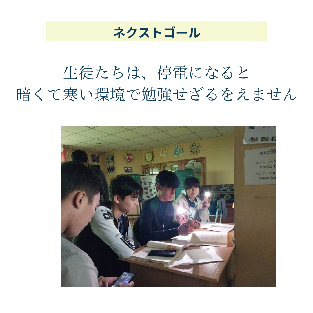 また冬になるにつれて、停電になる回数がとても多くなってきました。この先がとても不安です。電気だけでなく、水道設備も寒くなるにつれて思うように動かなくなります。。。日本人ボランティアはNoriko学級がある建物の1階に住んでいるのですが、昨日まで約3日間シャワーに入ることができませんでした。。。昨日は洗濯機が動かなかったりと冬になると生活基盤がとてももろくなって、毎日問題を抱えながら生活しています
