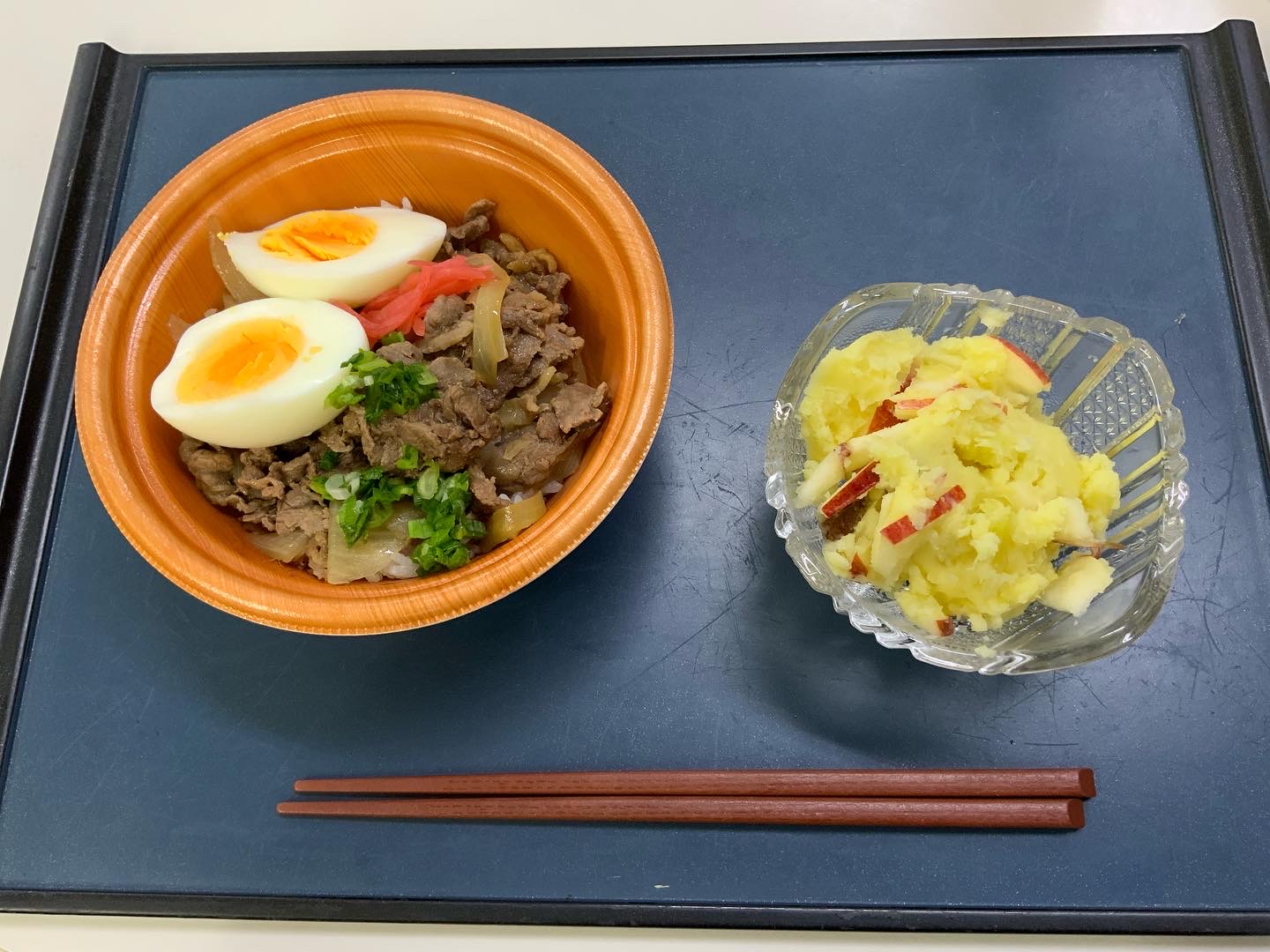 お昼は牛丼とさつまいものサラダです。のぞみ会彦根支部の役員さんの手作りです。朝早くから来ていただき、子ども達のために作って下さいました。とても美味しくて、沢山おかわりした子もいました。いっぱい食べて大きくなってね。