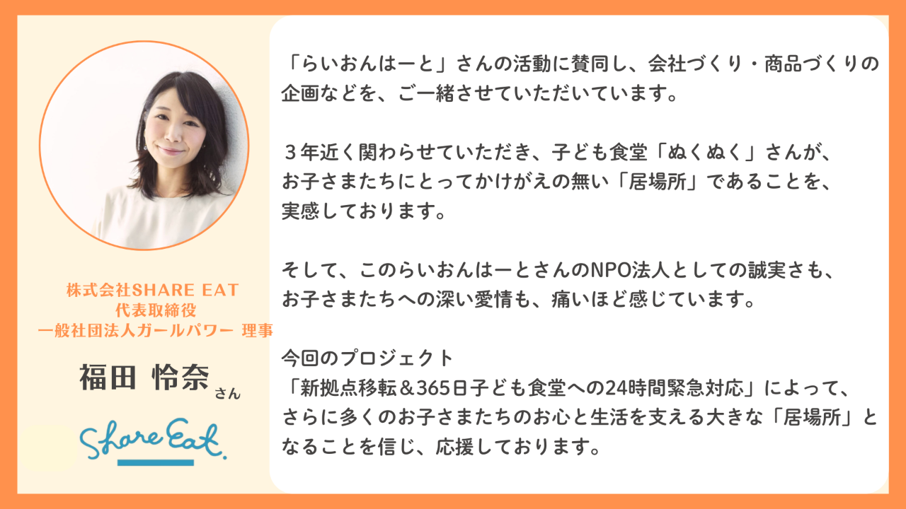 他人事を自分事と捉え、すべての子どもたちが豊かで幸せな人生を送れる社会を目指し、「子ども食堂なんてもう必要ないよね」と言える社会の実現に向けて、この活動をその日まで継続する為に、今回のこの挑戦へ皆さまの応援、ご支援をよろしくお願いいたします。