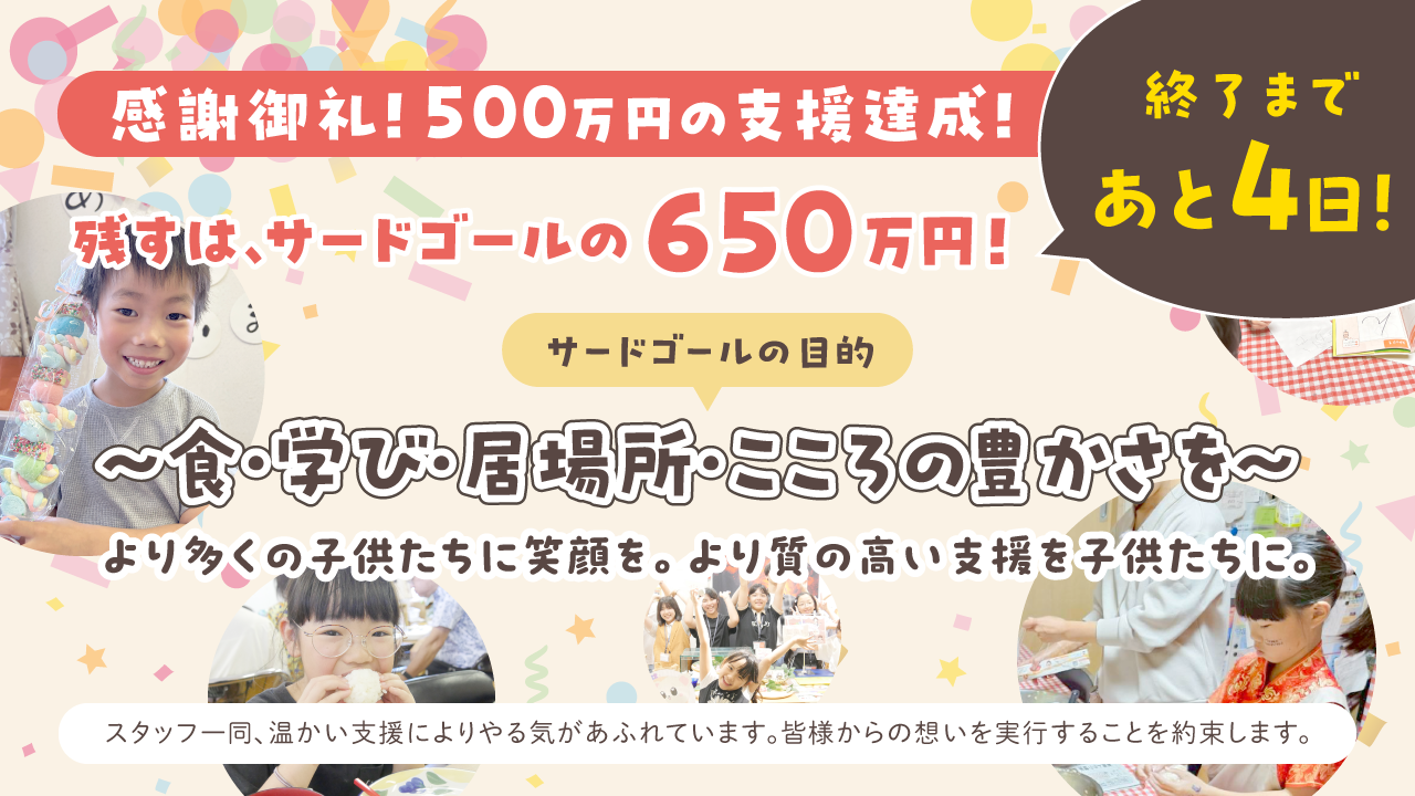 2026-01-25 09:30🚩【緊急のお願い】本日1/25(日)「クラファン一斉拡散デー」にご協力ください!皆さま、連日の温かいご支援を本当にありがとうございます💖 おかげさまでネクストゴールを達成いたしましたが、私たちは今、サードゴール【650万円】という大きな壁に挑戦しています。 なぜ、650万円が必要なのか。 あと150万円のご支援があれば、活動の基盤を固め、腰を据えて運営を守り抜く「1年間」を確保できます。この1年があれば、私たちはもっと強くなれる。もっと多くの子どもたちを抱きしめることができます。 この場所を半年で終わらせず、まずは「1年間、絶対に途切れない居場所」として確立させるため、最後の一押しをお願いしたく、SNSでの一斉シェアイベントを企画しました!2026-01-25 09:30🚩【緊急のお願い】本日1/25(日)「クラファン一斉拡散デー」にご協力ください!皆さま、連日の温かいご支援を本当にありがとうございます💖 おかげさまでネクストゴールを達成いたしましたが、私たちは今、サードゴール【650万円】という大きな壁に挑戦しています。 なぜ、650万円が必要なのか。 あと150万円のご支援があれば、活動の基盤を固め、腰を据えて運営を守り抜く「1年間」を確保できます。この1年があれば、私たちはもっと強くなれる。もっと多くの子どもたちを抱きしめることができます。 この場所を半年で終わらせず、まずは「1年間、絶対に途切れない居場所」として確立させるため、最後の一押しをお願いしたく、SNSでの一斉シェアイベントを企画しました!