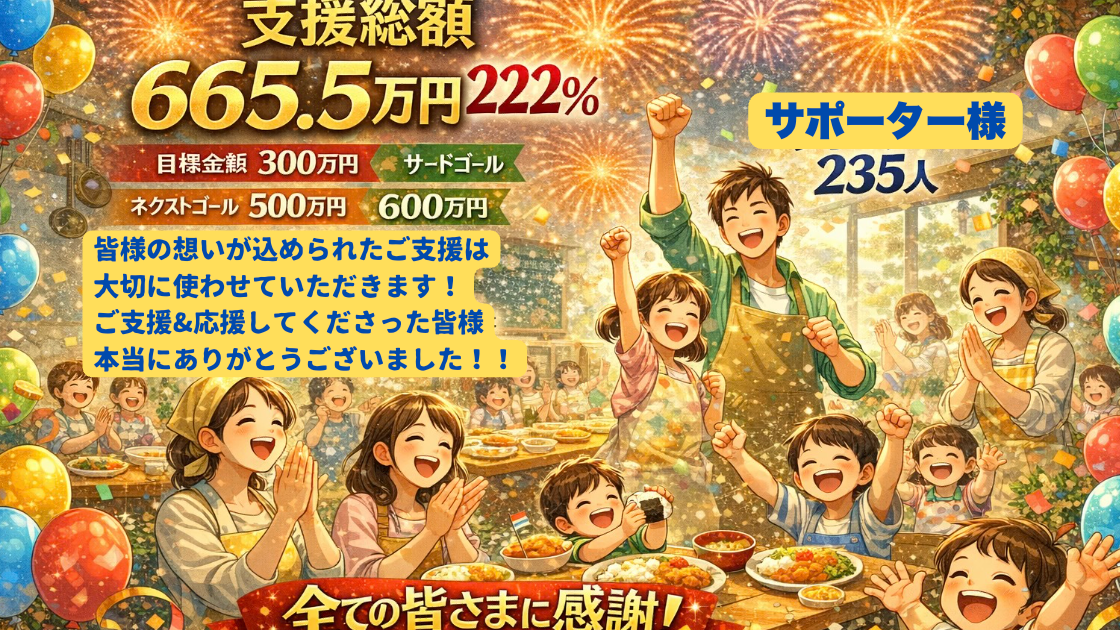 2025-12-15 11:52【目標達成!】300万円突破の快挙!ネクストゴール500万円で「24時間緊急対応型子ども食堂」へ!昨日 12月14日(日)21時過ぎ、 皆さまの温かいご支援により、第一目標300万円を達成することができました!2025-12-15 11:52【目標達成!】300万円突破の快挙!ネクストゴール500万円で「24時間緊急対応型子ども食堂」へ!昨日 12月14日(日)21時過ぎ、 皆さまの温かいご支援により、第一目標300万円を達成することができました!