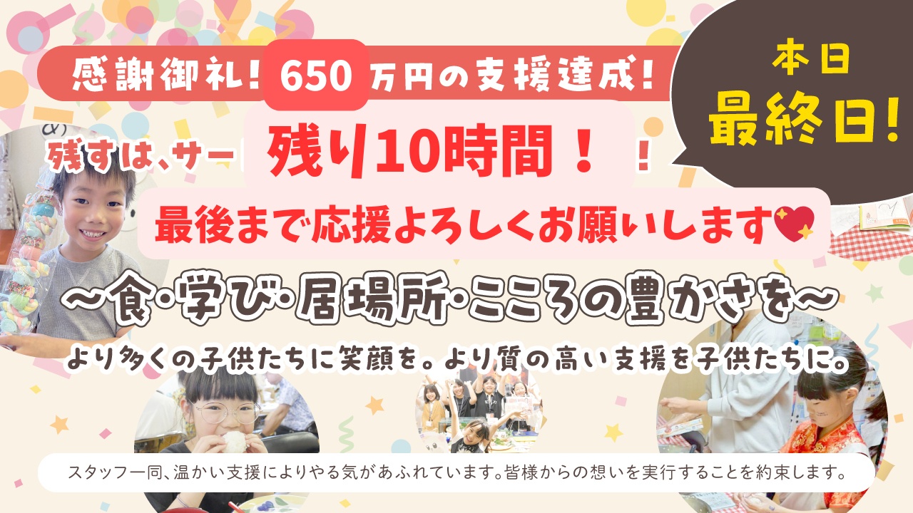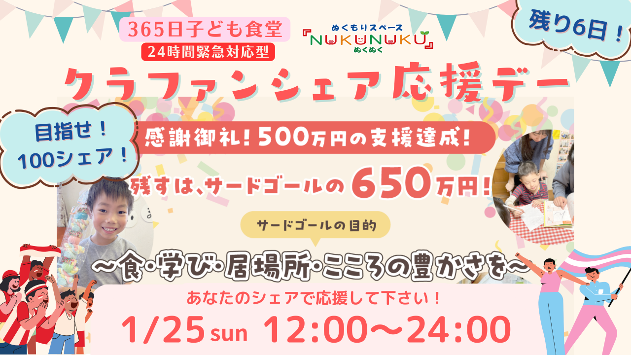 2026-01-25 09:30🚩【緊急のお願い】本日1/25(日)「クラファン一斉拡散デー」にご協力ください!皆さま、連日の温かいご支援を本当にありがとうございます💖 おかげさまでネクストゴールを達成いたしましたが、私たちは今、サードゴール【650万円】という大きな壁に挑戦しています。 なぜ、650万円が必要なのか。 あと150万円のご支援があれば、活動の基盤を固め、腰を据えて運営を守り抜く「1年間」を確保できます。この1年があれば、私たちはもっと強くなれる。もっと多くの子どもたちを抱きしめることができます。 この場所を半年で終わらせず、まずは「1年間、絶対に途切れない居場所」として確立させるため、最後の一押しをお願いしたく、SNSでの一斉シェアイベントを企画しました!2026-01-25 09:30🚩【緊急のお願い】本日1/25(日)「クラファン一斉拡散デー」にご協力ください!皆さま、連日の温かいご支援を本当にありがとうございます💖 おかげさまでネクストゴールを達成いたしましたが、私たちは今、サードゴール【650万円】という大きな壁に挑戦しています。 なぜ、650万円が必要なのか。 あと150万円のご支援があれば、活動の基盤を固め、腰を据えて運営を守り抜く「1年間」を確保できます。この1年があれば、私たちはもっと強くなれる。もっと多くの子どもたちを抱きしめることができます。 この場所を半年で終わらせず、まずは「1年間、絶対に途切れない居場所」として確立させるため、最後の一押しをお願いしたく、SNSでの一斉シェアイベントを企画しました!