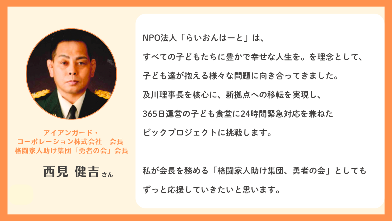 ここで育った子どもたちが困っている人に手を差し伸べる大人になり、それぞれの家庭が「子ども食堂」の役割を果たすようになれば、この名称は不要になります!