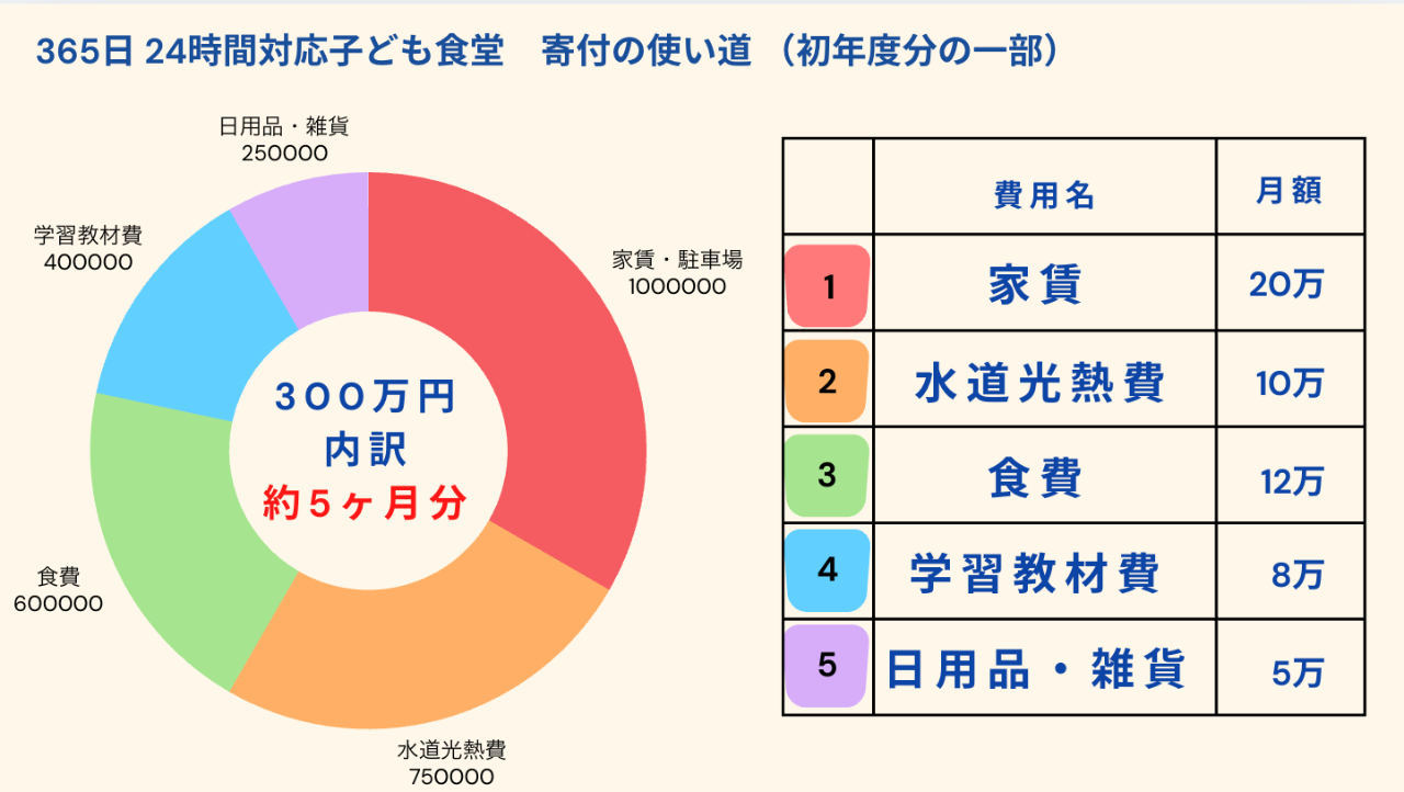 目標金額 300万。(初年度新拠点分の経費の約5ヶ月分・概算月額)
