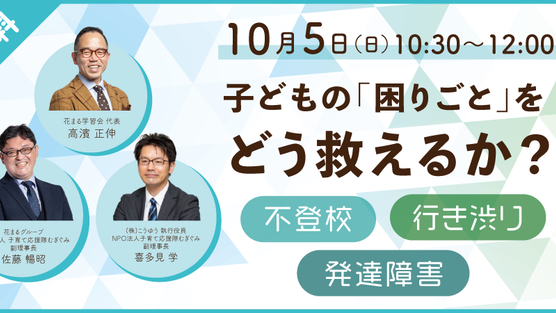 花まる学習会代表 NPO法人子育て応援隊むぎぐみ 理事長でもある高濱正伸と、むぎぐみ副理事長 佐藤暢昭、東京公認心理師協会理事 喜多見学の3人が、現代の子ども達の「困りごと」にお答えします。