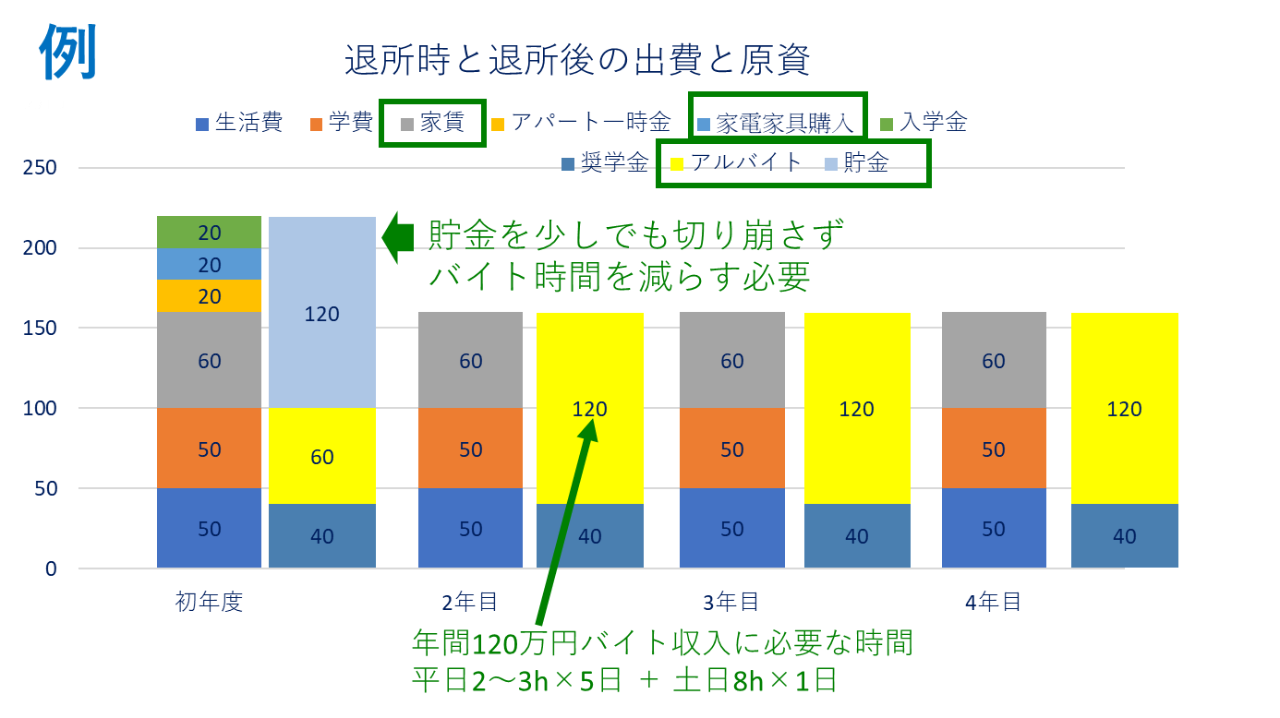 家電や家具の寄贈を受けることにより購入費20万円を節約できると、初年度の平日1日3時間×半年分のアルバイト時間を減らすことができます。